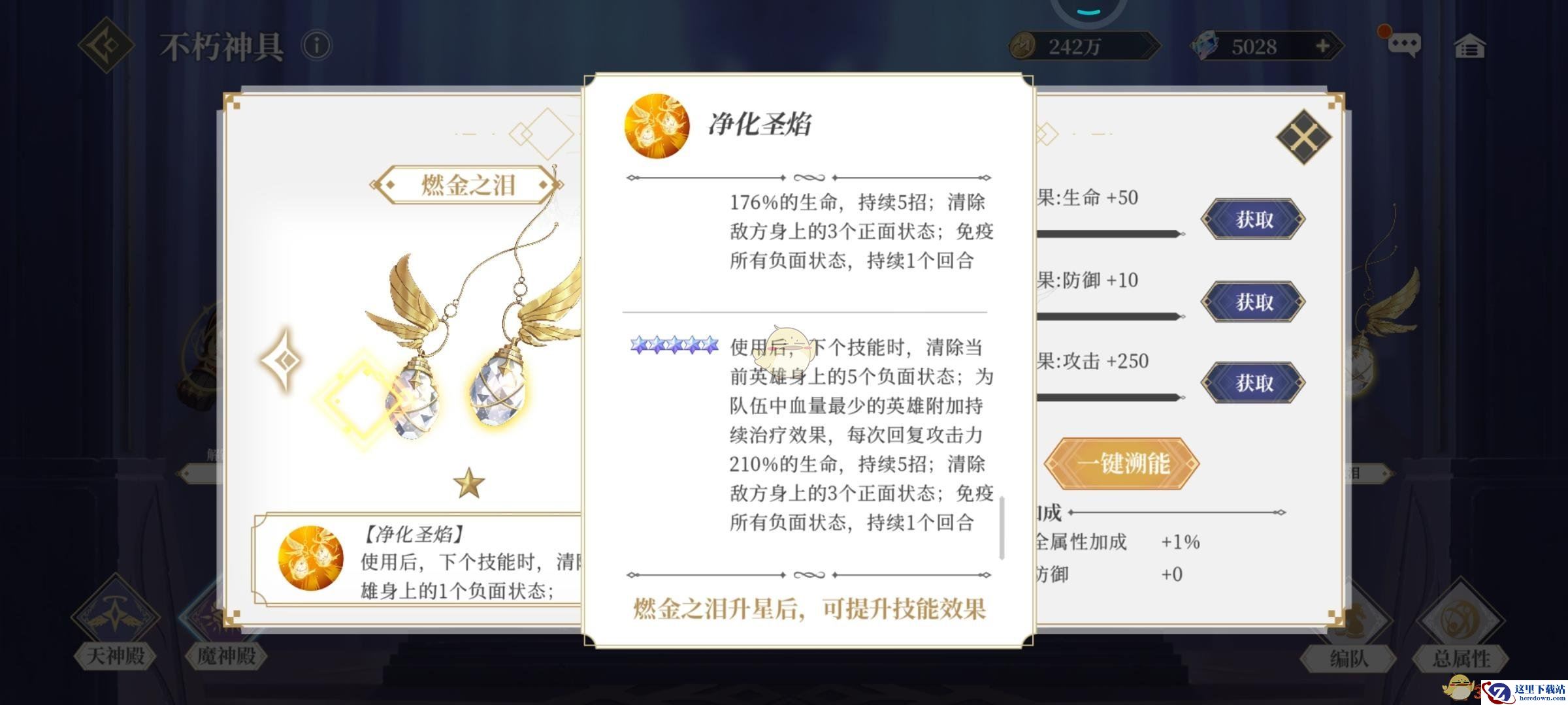 2星起步,使用后额外为队伍中血量最少的英雄附加持续治疗效果,每次回复攻击力75%的生命,持续5招;