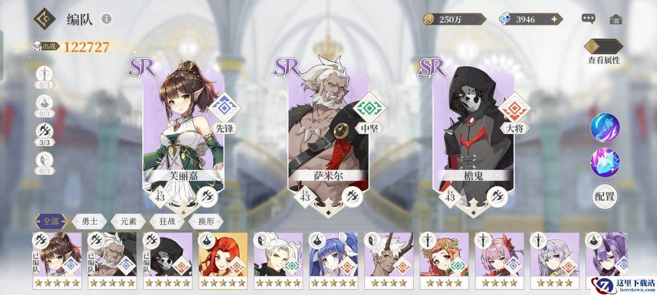 2、阵容分析:在芙丽嘉给大反派萨米尔套上吸血buff后,一般是能站到下次支援的,实在不行可以开个减伤50%的神器顶一下