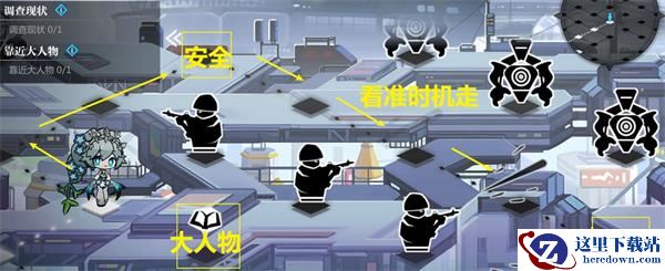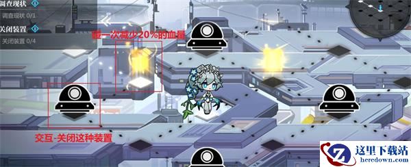 2.避免碰到黄光,碰一次减少20%血量,关闭四个装置