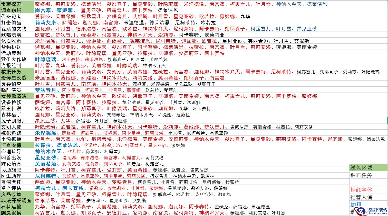 2、每种任务推荐的角色都不同,蓝色是最优先级推荐的。