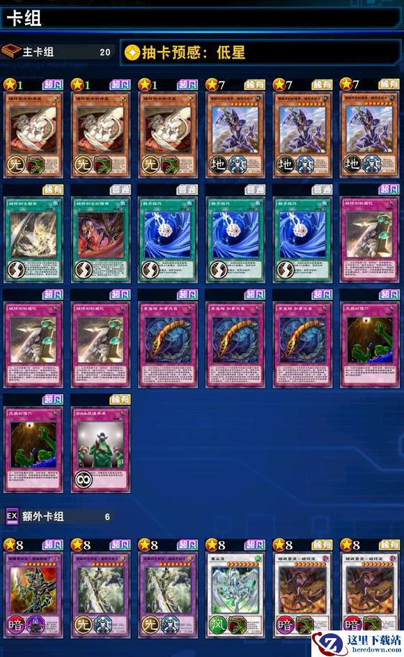 技能携带「抽卡预感:低星」,掉1000生命值可以稳定检索卡组「破坏剑士的伴龙」。因为现在环境有「芳香卡组」的存在,「旋风」比「夜摄」吹贴纸更好用,为了方便扣血也可以携带「骰子旋风」,「无底的落穴」和「古生物 加拿大虫」一类的打断坑适量投入,「DNA改造手术」能直接改变场上怪兽种族配合「破坏剑士融合」直接融对面,卷星的天梯也遇到很多携带「侠客的七道具」和「轮回之珀尔修斯」达到打断、扣血的效果。本家卡以外的构筑空间比较灵活,可以根据自己的卡池选泽清后场、保前场的合适卡片。