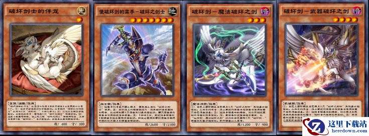 「破坏之剑士」:对方场上怪兽被破坏送入墓地,可以把那只怪兽当做装备卡给此卡装备。可以将此卡装备的怪兽卡送墓,破坏对方场上送墓怪兽相同种族的怪兽。