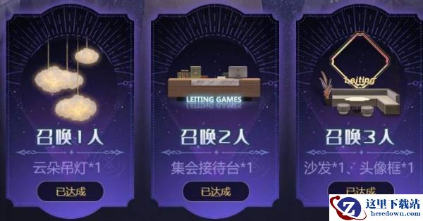 1、召唤奖励类似于很多游戏的拉推广,可以通过在官网找到。召唤一人的奖励是云朵吊灯*1,召唤2人的奖励是集会接待台*1,召唤3人的奖励是沙发*1、头像框*1,也就是一整套的雷霆家具。