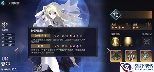 祈祷圣光,拥有群体治疗和单体伤害提升效果,她的坦度比较低,需要肉盾角色的保护,在后期副本玩法中,有不错的作用。