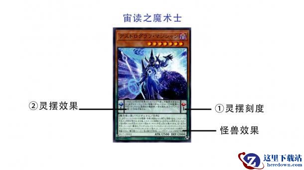 以宙读之魔术士为例,灵摆卡牌在效果怪兽的基础上,增加了灵摆刻度和灵摆效果。