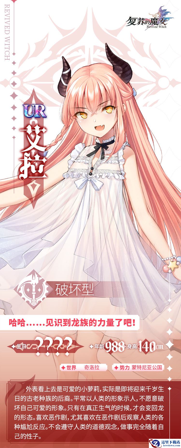 火龙在复苏的魔女手游中是龙之少女-艾拉,这是一位UR角色,另外绰号也可以简称【龙】,不过通常叫火龙比较多。人形态喷火的样子有点憨憨的,技能后摇为1s,本身的1技能协同及大招的高额加成,而且突破给的持续回血,可以说是目前的T0人物了