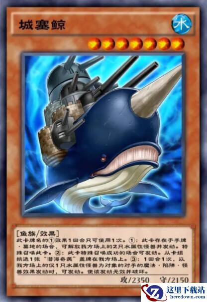 城塞鲸又称水属性机甲要塞,有着解放场上两只水属性怪兽特召并检索潜海奇袭的能力,一回合一次还可以提供针对水属性怪兽的取对象抗性。而潜海奇袭则可以通过除外水属性怪兽来保证魔法陷阱不被破坏,并为等级五以上的水属性怪兽提供不取对象的破坏抗性效果,两者携手可谓攻防一体。