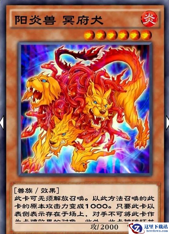 冥府犬,阳炎兽唯一可以不依赖魔陷上场的六星,要损失1000打点上场,检索一张阳炎卡片,可以检索魔陷