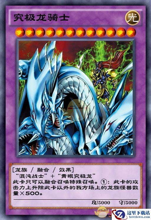 海马濑人与暗游戏联手才能召唤出的王牌怪兽。原本攻击力5000点,是所有怪兽中最高的。如果自己场上还有其他的龙族怪兽,这张卡的攻击力还可以进一步提升。