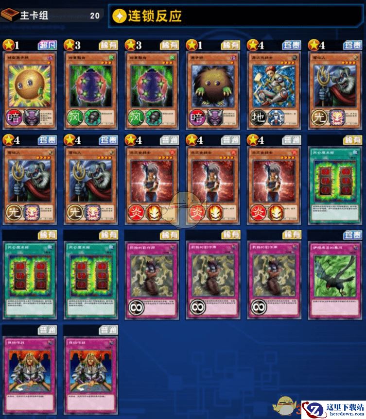 注意雷仙人被魔术箱放到对面时,如果自己的怪兽攻击高于1300,打死了雷仙人自己会扣5000血,要用低攻击的,也可以带针球换下女战士(1000伤害,攻击小于1300,这样连锁反应都不用带,换生命值增加α加强苟命)卡组不是固定的,如果不是没钱,谁不想拥有3个球形栗子球呢,我还带了普通栗子球QAQ,甚至针球也不是必须的,可以带一堆陷阱卡苟过去,5张陷阱卡配合连锁反应打1000伤害就行。