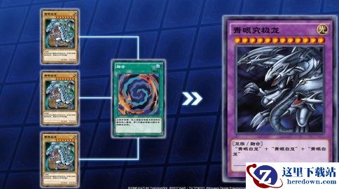 以融合怪兽“青眼究极龙”为例,它所需的融合素材为3只“青眼白龙”。当自己场上和手牌集齐3只“青眼白龙”时,发动“融合”魔法卡,将集齐的3只“青眼白龙”送去墓地,即可将“青眼究极龙”从额外卡组特殊召唤到场上。