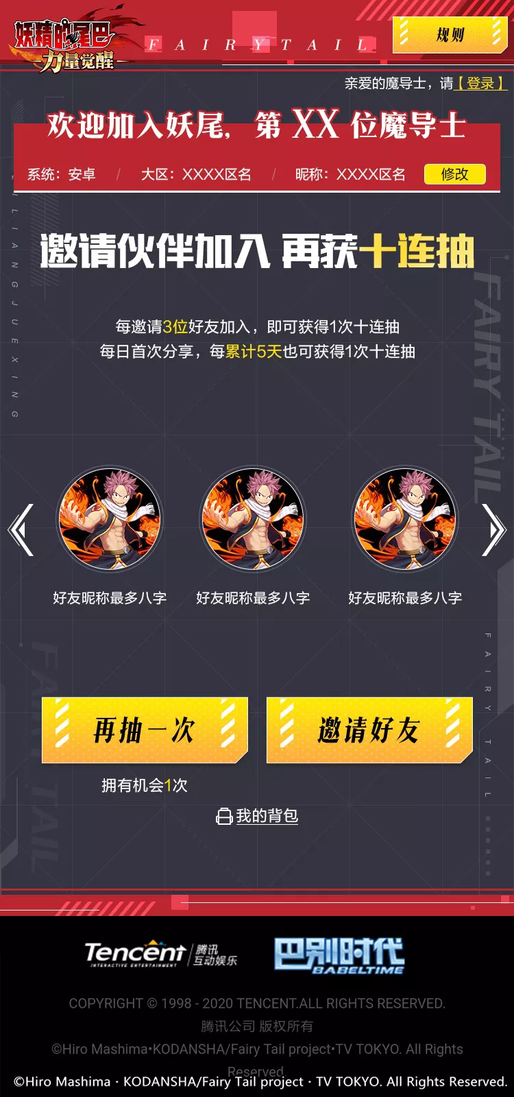 首先是每日分享活动界面,累计五次即可获赠官方准备的十连抽机会啦~,魔导士们也可以邀请小伙伴一同进行预创角,每邀请三位就可以获得一次十连抽机会,心不心动!