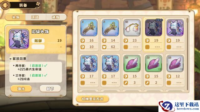 其中,头饰主要提供防御能力,项链提供生命值,戒指提供攻击能力。