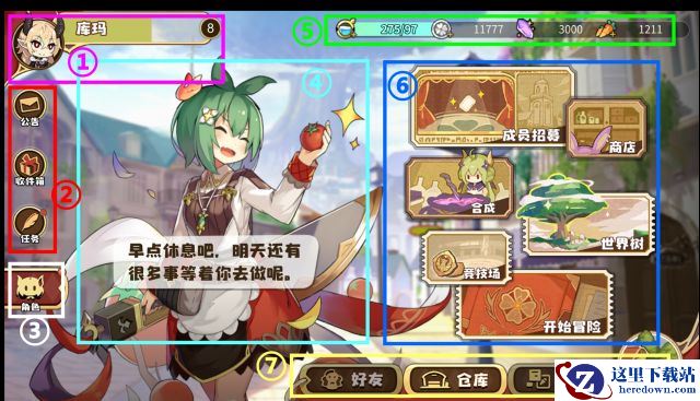 6、右侧主功能菜单区:成员招募(抽卡、精华兑换所)、商店(神秘商店、竞技币兑换所、琥珀兑换所)、合成(道具合成、宝石合成)、世界树、竞技场、开始冒险(冒险大地图);