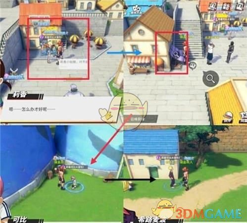 找到图一莉香后,去图2处拿金枪鱼,取得饭团去图三找可比,最后去揍希路麦波一顿就可以完成任务。