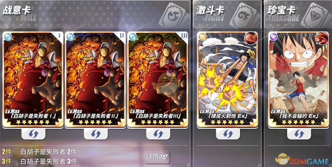 白胡子是失败者套装(破盾伤害、破盾后伤害加深):路飞的战意卡建议选择[白胡子是失败者套装],因为游戏中拥有护盾机制,再加上路飞本身拥有的增强对护盾伤害,这套战意卡可以将路飞的伤害最大化。对于对手来说”打又打不到,被摸一下又很痛“莫过于此了。