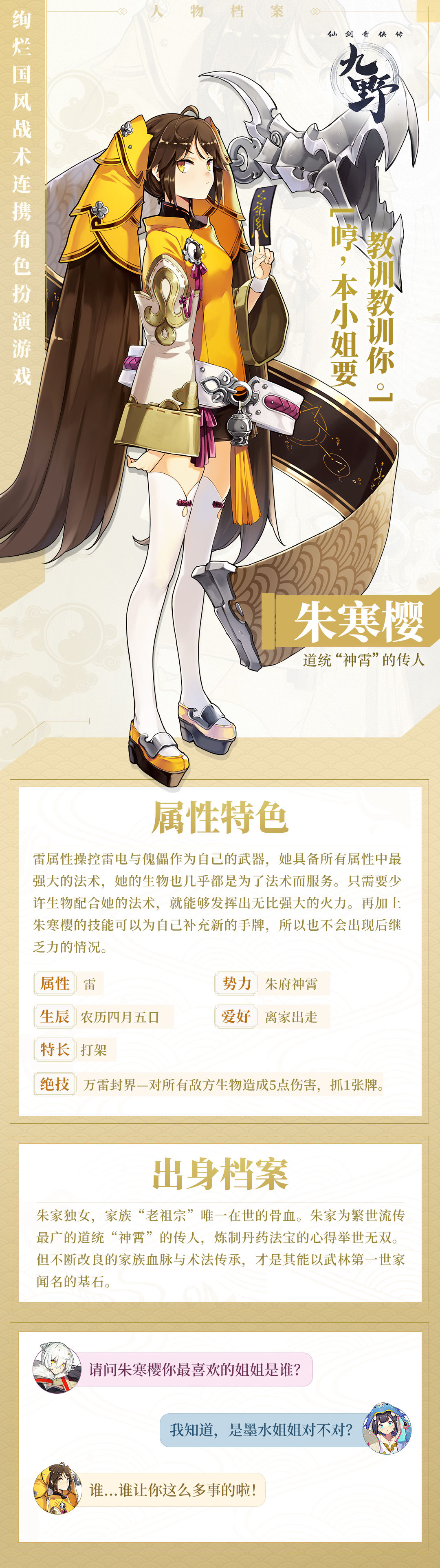 雷属性操控雷电与傀儡作为自己的武器,她具备所有属性中最强大的法术,她的生物也几乎都是为了法术而服务。只需要少许生物配合她的法术,就能够发挥出无比强大的火力。虽然本身很脆弱,雷属性几乎不会担忧缺乏手牌,她的法术还能创造出新的法术,以确保其能够源源不断的制造输出。即使火力倾泻过猛,有些后力不继,她的绝技也能在摧毁对手场面的同时,对自己的弹药进行一次补充。