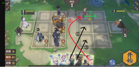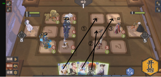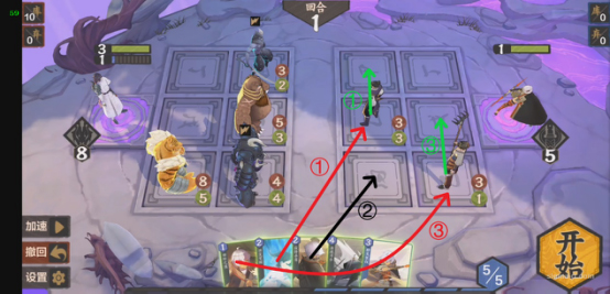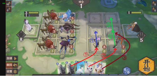 通过观察可以发现,这一个残卷我们是不可能打到对手脸上的,不过由于对手场上有三个食人树让对面慢性死亡,所以这一局只要保证自己的英雄和对手的食人树不死就赢了,对手的狻猊能让正面生物变成(X1Z),己方战神(488)存活时间短,所以要用后排的武者移到上路,为了利用战神,需要让他去中路防守。为抵御蜘蛛,需要武士正面碰,后排需要俩杀不死食人树的将武者顶上去,位置任意。