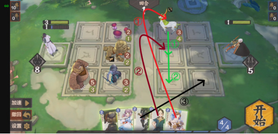 本关需要巧妙使用法术。通过对局势的观察发现,我们必须从上路或中路破敌,同时3灵和4灵法术消耗太大,肯定不能使用。所以应当从其他的法术卡里想办法,如果要从上路破敌,显然是不现实的,因为至少需要在后排放上两张卡,导致卡不够用,所以采取中路破敌,上路就利用某张法术将(233)推上去,中路利用某张法术将(131)推上去同时在场的一张法术保证其不死,同时将(444)抵挡住又需要一张法术(注意幼时之盟会抽卡暴死,所以一定要在其翻开之前结束战斗,指定随机)。