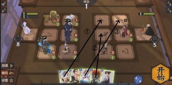 本关需要巧妙使用法术。通过对局势的观察发现,我们必须从上路或中路破敌,同时3灵和4灵法术消耗太大,肯定不能使用。所以应当从其他的法术卡里想办法,如果要从上路破敌,显然是不现实的,因为至少需要在后排放上两张卡,导致卡不够用,所以采取中路破敌,上路就利用某张法术将(233)推上去,中路利用某张法术将(131)推上去同时在场的一张法术保证其不死,同时将(444)抵挡住又需要一张法术(注意幼时之盟会抽卡暴死,所以一定要在其翻开之前结束战斗,指定随机),思路如下: