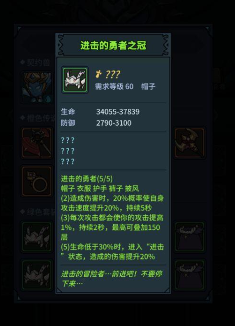 先是勇3,只有套装是我们需要的,还是老样子用3+2的方式搭配,在这我推荐各位刷出3件进击套,仔细看这个叠攻击的buff,打boss如果没有控制,真的是不要太厉害。。。后续会继续讲到。