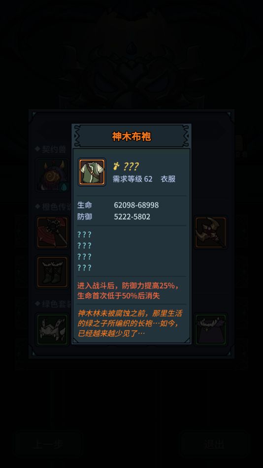 没关系,接下来就要说到的是勇4小怪爆的一件神级装备——神木布袍。为什么说神级,因为这个词缀实在太契合我们的防御通关要求了,“防御提高25%,生命低于50%消失”,也就是说只要保持半血以上,这就是永久buff,好家伙,这不刷出来能有天理?