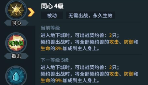 其实第二关的主要打法是让你学会使用第一关通关后开启的功能,例如主角的技能学习与升级,这边建议把等级先升到20级以上,第一个与宠物有关的同心技能对于刷副本的作用非常大,当你升到六级的时候可以帮助你出战三个宠物,刷怪难度也大大下降。