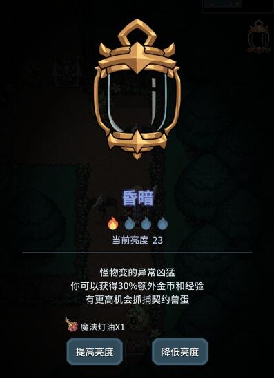 这个灯相当于难度调节器,有四个档次,且会慢慢熄灭,也可以开头就自己手动把亮度调低。当灯亮度降低后可以通过消耗魔法灯油来逐渐回复亮度。