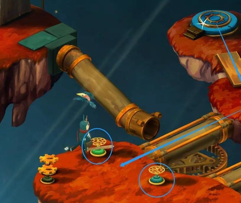 再回来转动蓝色风塔的把手,吹向右上角,放上绿色风塔的把手