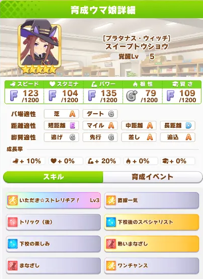 发动条件为在进入最终弯道前都保持在队伍50%之后(大赛5~9名)且没发生过焦躁,在距离终点300米时发动,持续时间6s,效果量0.35