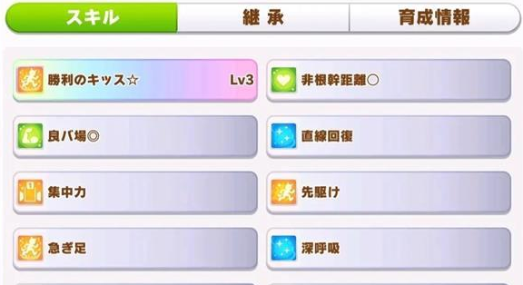 - 依旧是优先长距、逃、速、耐等因子。继承技能最好带有回复技。我这里选的父母带了一个回复技,同时属性加成均衡的同时侧重速度。因子我这次放弃了,因为这玩意太看脸,测试中好几次带了高比例长距因子却一个也没捞到_(:з」∠)_。另外,选父母的那个界面右上角有个小按钮“スキル”可以查看概率继承的技能。