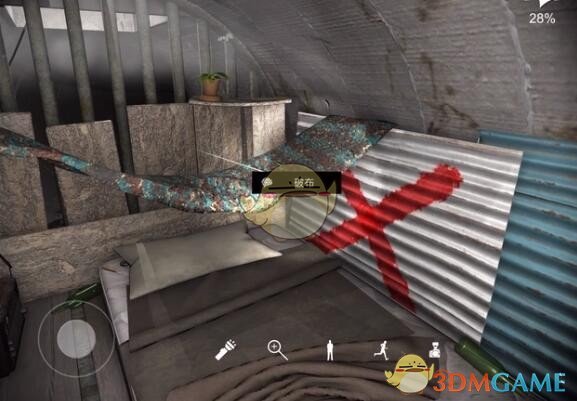 来到床边上,调整到视角,在图中所示的位置找到这个线索,不是特别容易找到。