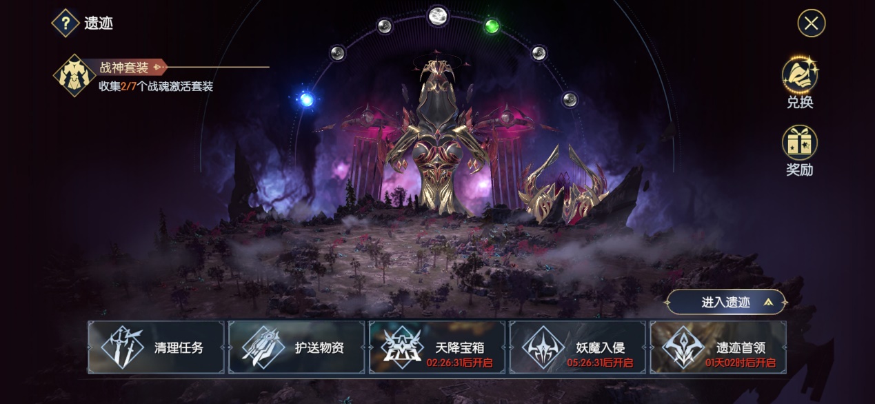 在遗迹中肝任务,可以获取七色战魂,用来解锁战神套装。