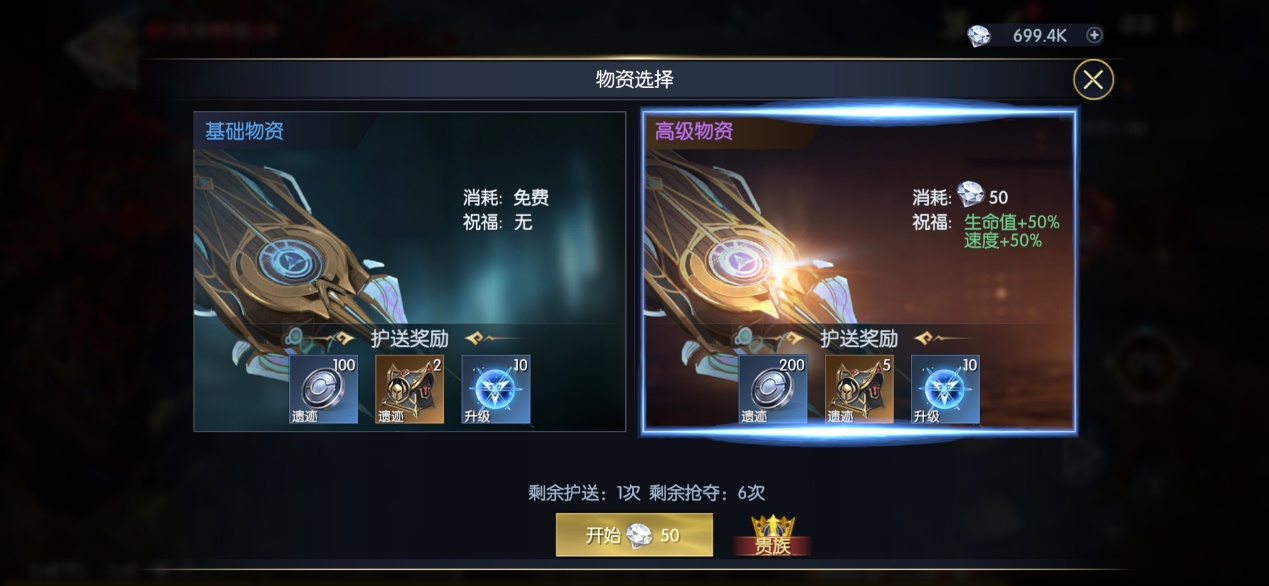 护送物资是PVP属性较强的劫镖玩法。玩家只能进入PVP地图,从三条不同的线路中选择其中之一,开启护送。在没有贵族头衔的情况下,玩家每天只能护送一次物资,但可以抢夺六次物资。护送的物资数量和奖励,可以通过钻石进行提高。成功的话收益大翻倍,被劫的话就人财两空。