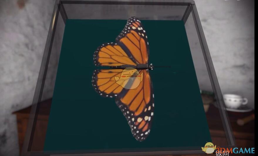线索详情:一个蝴蝶标本,装在一个塑料盒子里。