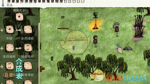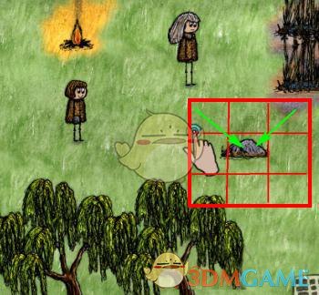 2、以教程关卡使用石头举例,当你手上有东西要用在另一个物体上的时候,如图范围内斜向滑动,就可以把石头磨成尖石头了。