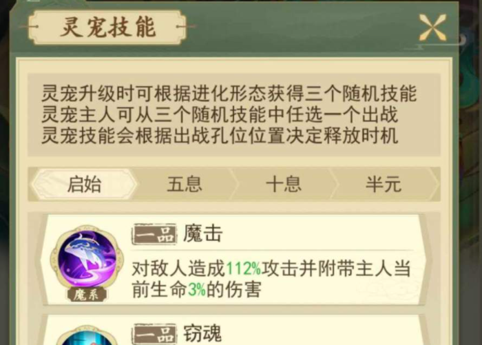 灵宠的技能位有四种,分别为“起始”,效果是在战斗开始时释放。