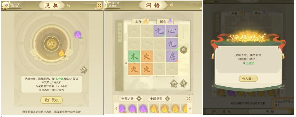 将灵机收于心炉,可进行拼图布位,阴阳相合,五行充盈,当书简上布满灵机时,洞悟功法可以获得更强的招式!
