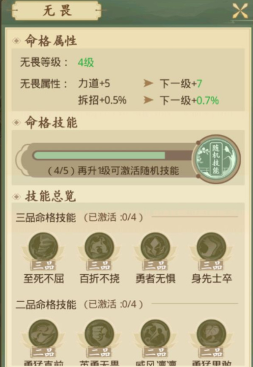 3、无畏:若大家选择的性格是无畏,那么这个性格将会增加大家的拆招属性,而当技能为一品时,可以提升力道值,当技能为二品以上时,可以提升资源获取的百分比;