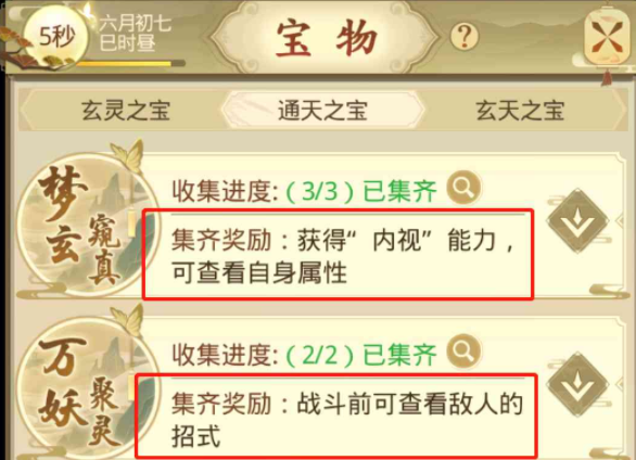 2、进入宝物界面,选择【通天之宝】,只要收集满3个通天之宝就可以得到内视能力了。而有了内视能力,我们就可以查看自己的人物属性了,是不是非常简单呢~
