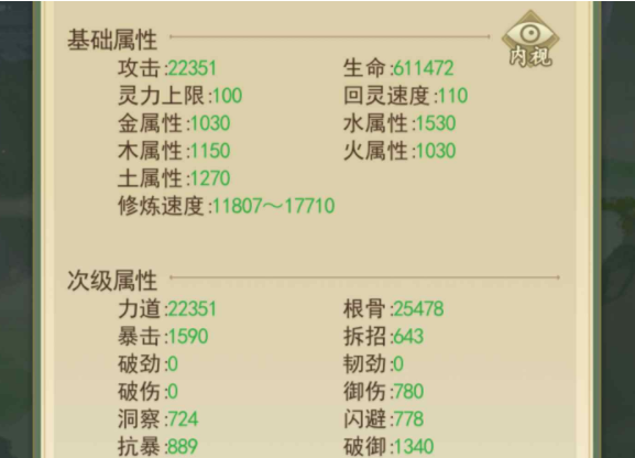 在获得内视能力之后,我们前往自身人物的属性面板,在基础属性的右上方就可以找到一个【内视】的按钮,点击它就可以直接查看自身的属性了。