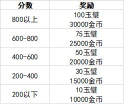 奖励共有5种等级,最高每周可以获得300玉璧,9w金币。获得何种奖励取决于最终分数,划分如下。