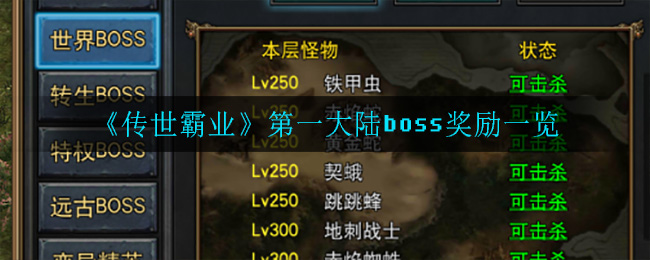 传世霸业第一大陆boss有什么奖励?在传世霸业中很多小伙伴在缺装备时都会去打boss,很多小伙伴都很想知道第一大陆boss都会掉落什么装备,今天小编给大家带来了《传世霸业》第一大陆boss奖励一览,一起来看看吧。