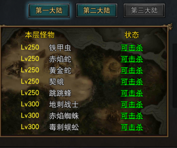 第一大陆为公共BOSS地图,玩家可自由PK。最高可以击杀30级BOSS。可掉落8阶套装。将传奇之路等级提升至二星战狂可进入第二大陆