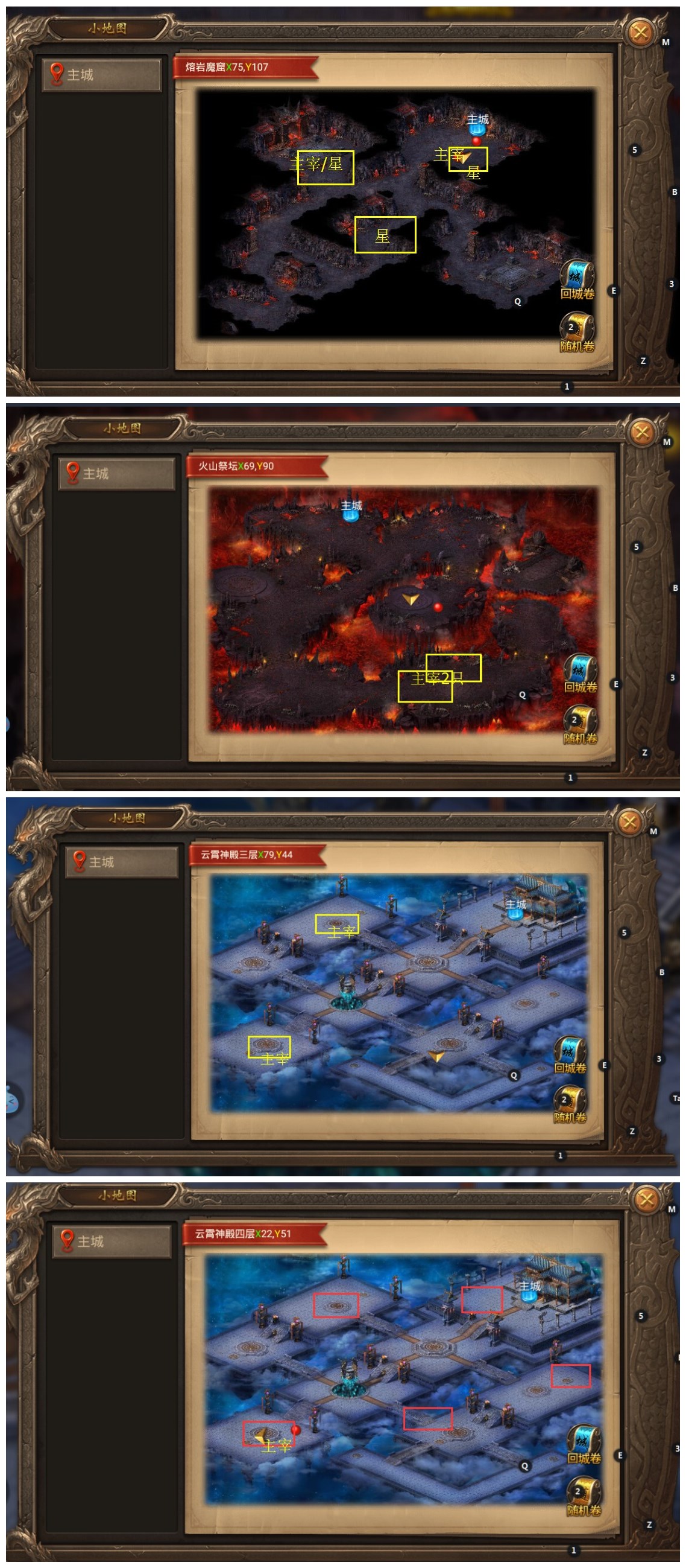 回答:云霄神殿三层、熔岩魔窟、火山祭坛、虚无幻境三层