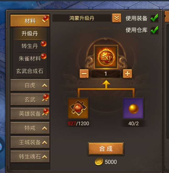 到500级后你会发现,鸿蒙、盘古、上古三种升级丹合成,除了碎片以外还要用另外一种经验丹之魂才能合成,这种道具限量产出,只有世界BOSS出,所以记得去拍它。