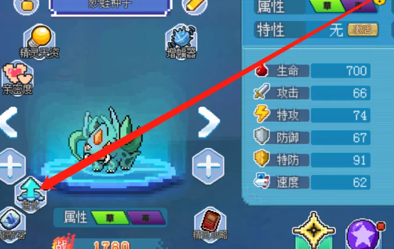 2、进入精灵属性页面,接着点击左下角的进化功能