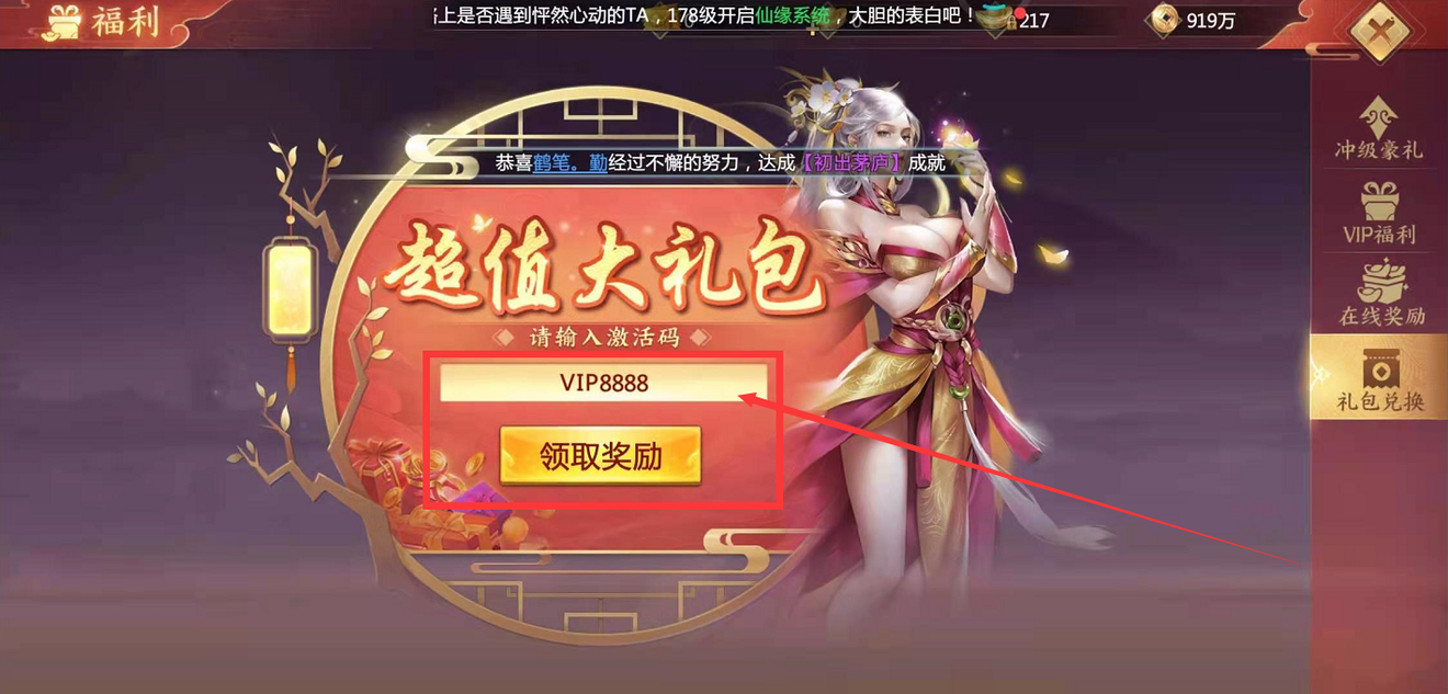 3:填写礼包兑换码、点击领取奖励: