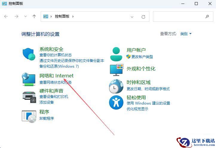 1、首先,打开Win11系统的控制面板界面,点击进入到“网络和Internet”设置。