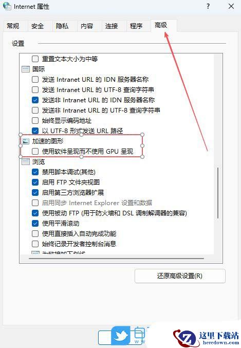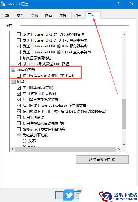 3、然后,在弹出的窗口中,切换到“高级”选项栏,再取消勾选“使用软件呈现而不使用GPU呈现”选项,点击确定即可。